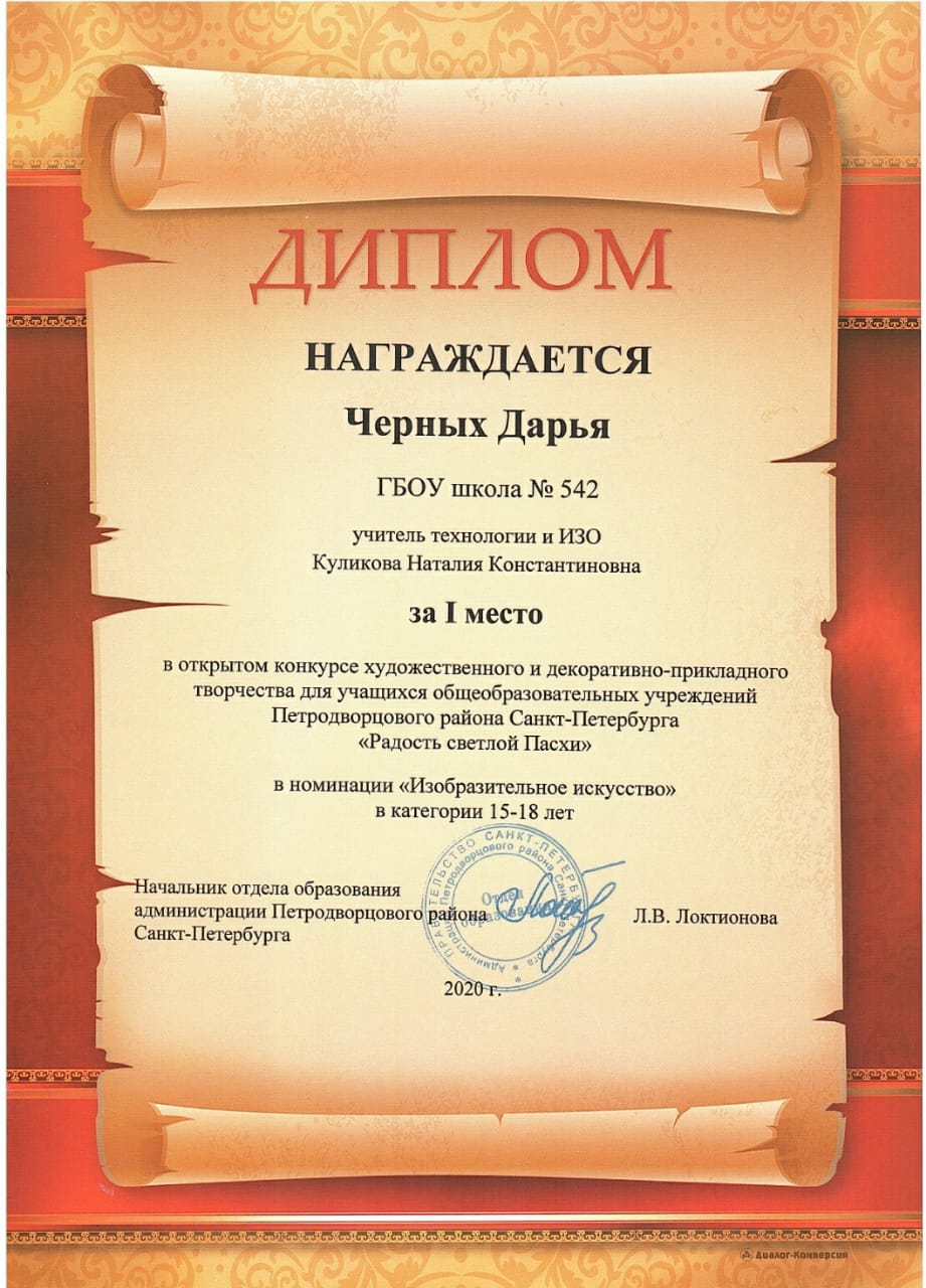 | Открытый конкурс художественного и декоративного-прикладного творчества «Радость светлой Пасхи" | 1 место | ![]() |