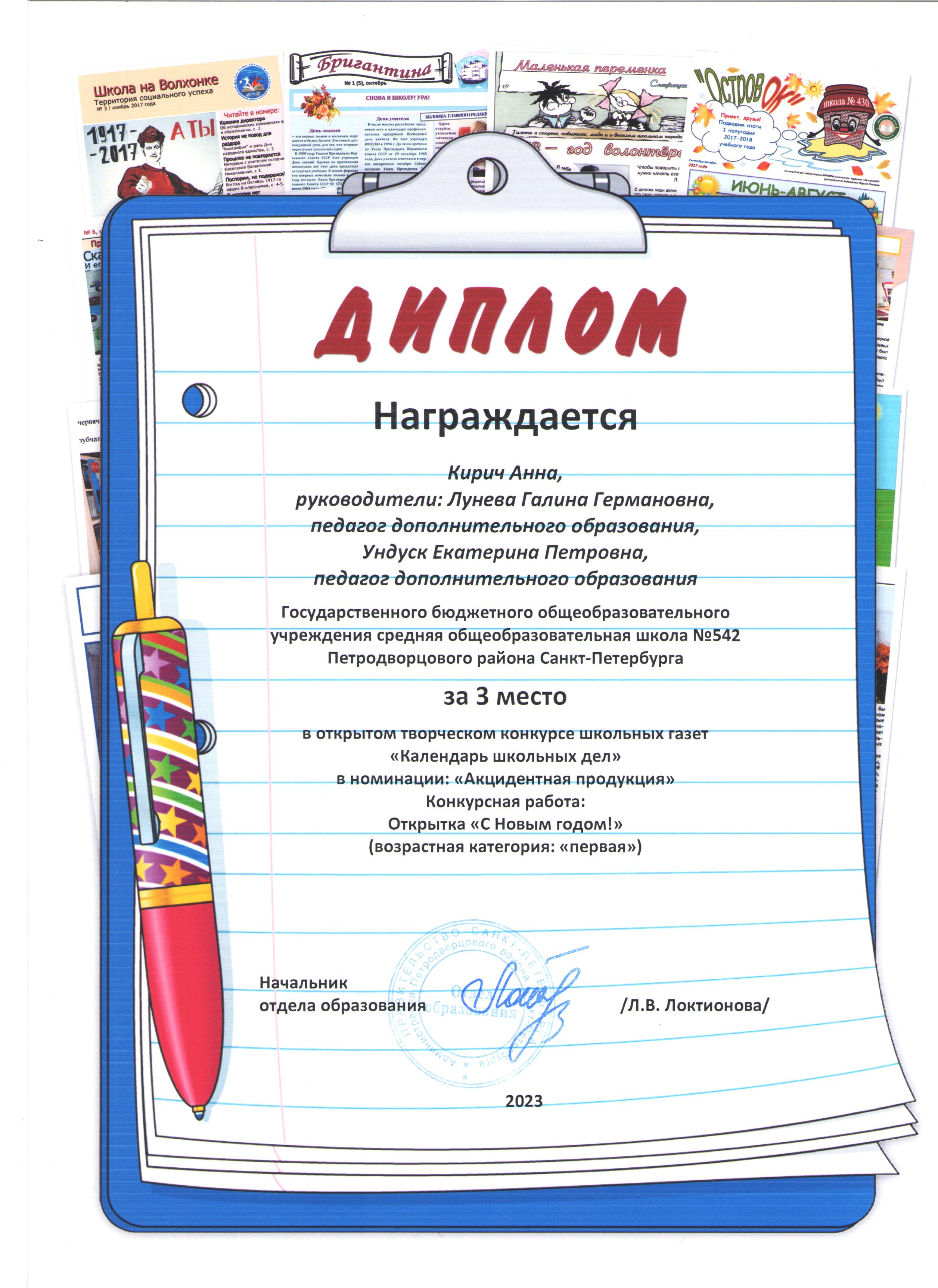 | Открытый творческий конкурс школьных газет«Календарь школьных дел» | 1 место - 2 диплома 2 место - 3 диплома 3 место - 2 диплома |