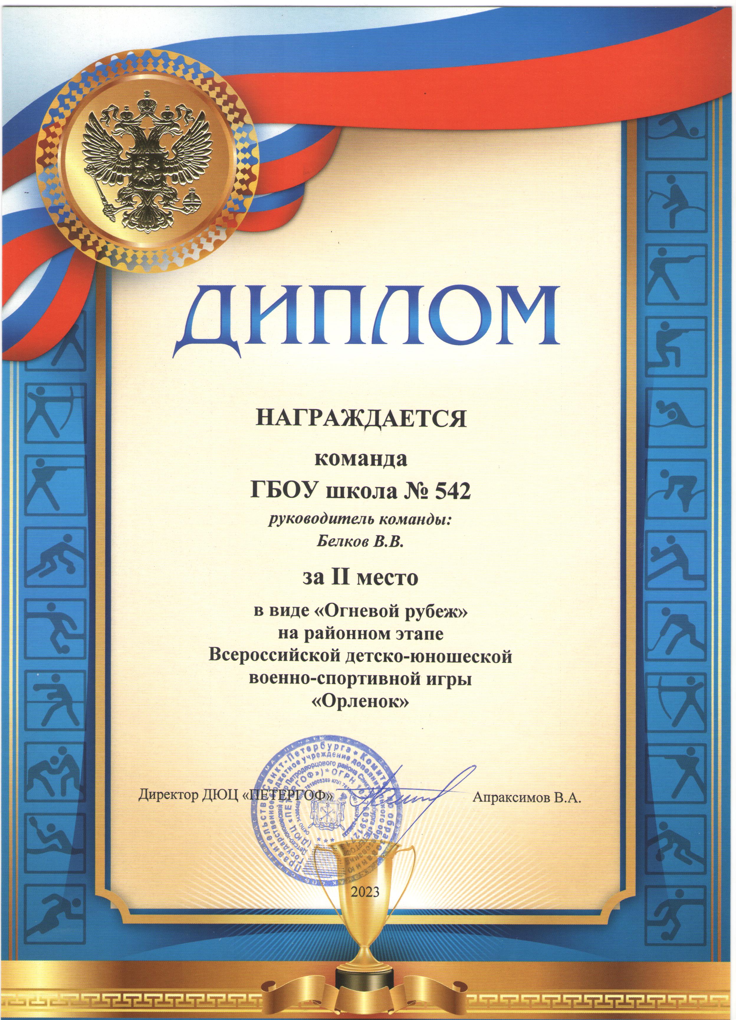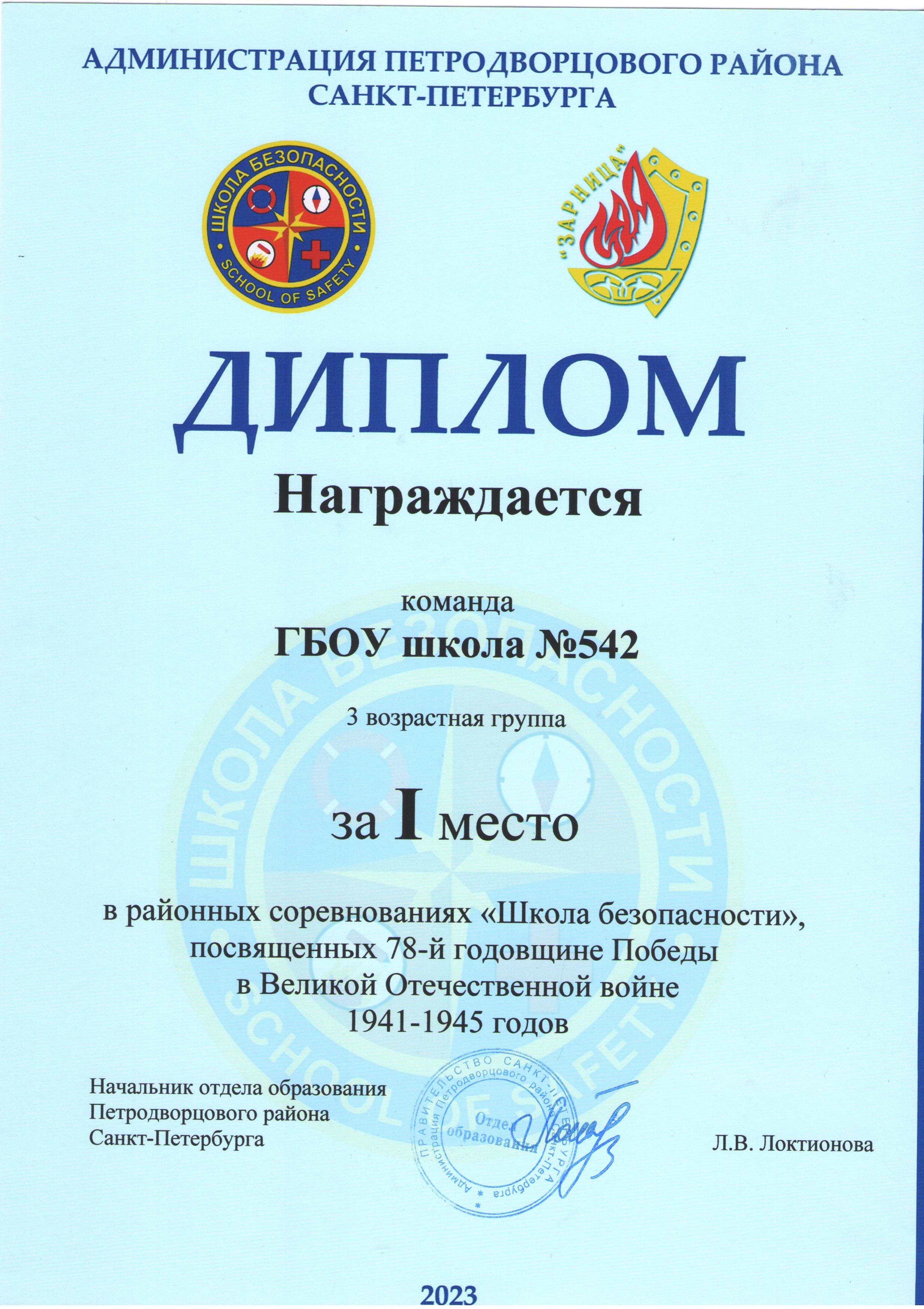 | Этап районных комплексных соревнований учащихся образовательных учреждений Петродворцового района Санкт-Петербурга в рамках военно-спортивной игры «Зарница»/«Орленок» и соревнований «Школа безопасности» - «Полоса выживания-2022», посвященный 78-й годовщине Победы в Великой Отечественной войне 1941-1945 гг. | 2 место | |