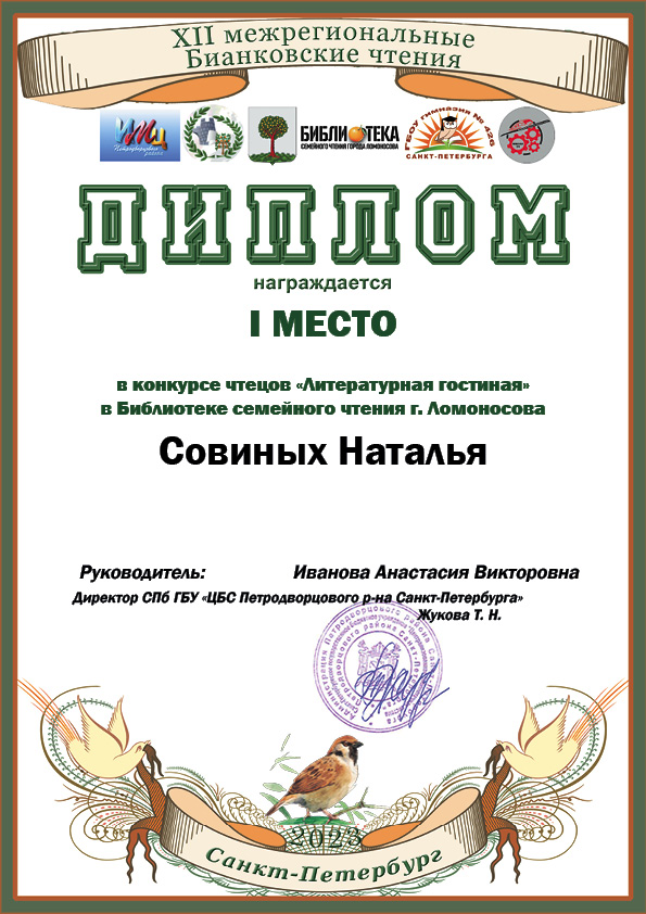 | Межрегиональный конкурс чтецов «Литературная гостиная» в рамках Бианковских чтений | Гран-при 1 место 2 место 3 место |