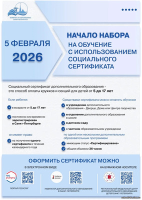 С 5 февраля 2026 года откроется электронная запись в учебные группы на краткосрочные дополнительные общеразвивающие программы по социальным сертификатам – ПФДО (персонифицированное дополнительное образование детей). Узнать больше >>.